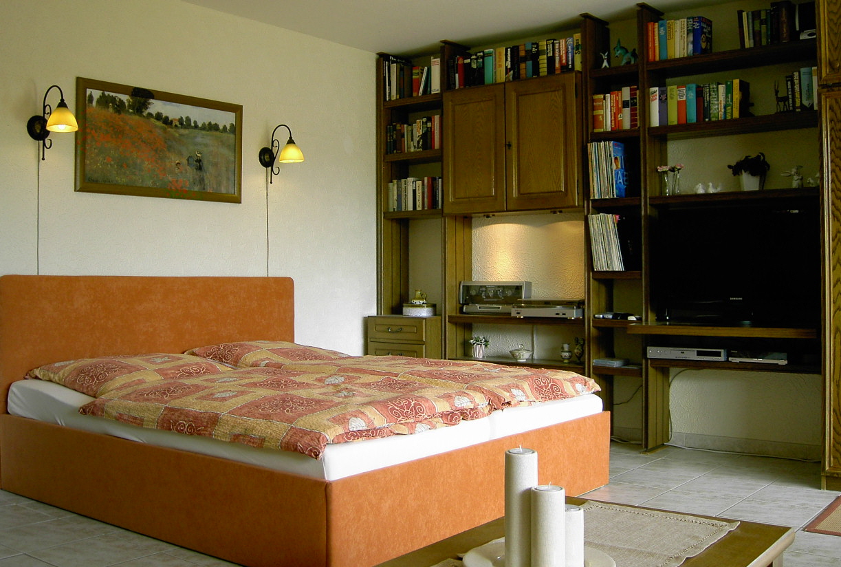 einer Seite befinden sich das Polsterdoppelbett mit Lattenrost