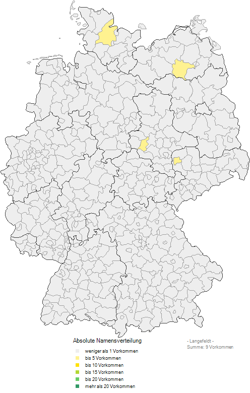 Allocation of the name 'Langefeldt' in Germany The name Langenfeld occurs a total of 9 times in 4 counties. There are an estimated 24 persons with this surname. This is below the average for all German surnames (bad statistical data for this name). It is thus the 208.731th most frequent name. Most